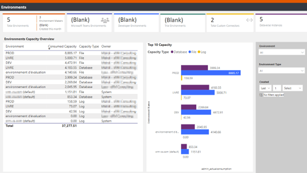 For further monitoring, in the folder unzipped from the starter kit, you’ll be able to find several Power BI reports. The Production_CoEDashboard_MMMYY.pbit contains many tabs that’ll help you see everything briefly. The “Environment Capacity” tab will let you see the type of data consumption as week as its value in MB.