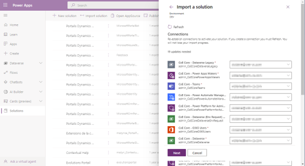 Upon importing, you’ll be prompted to create the necessary connections if they don’t exist already. This is because the CoE solution contains a vast variety of Cloud Flows for monitoring. So go ahead and connect to all of those using an account with admin access.