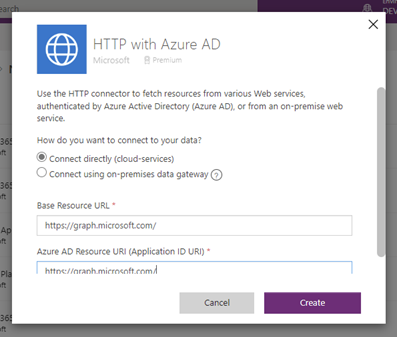 NB: for the HTTP with Azure AD, you’ll be asked to enter the Base Resource URL and the Azure AD Resource URI (Application ID URI). The URL to enter is https://graph.microsoft.com/